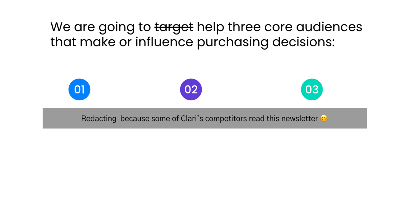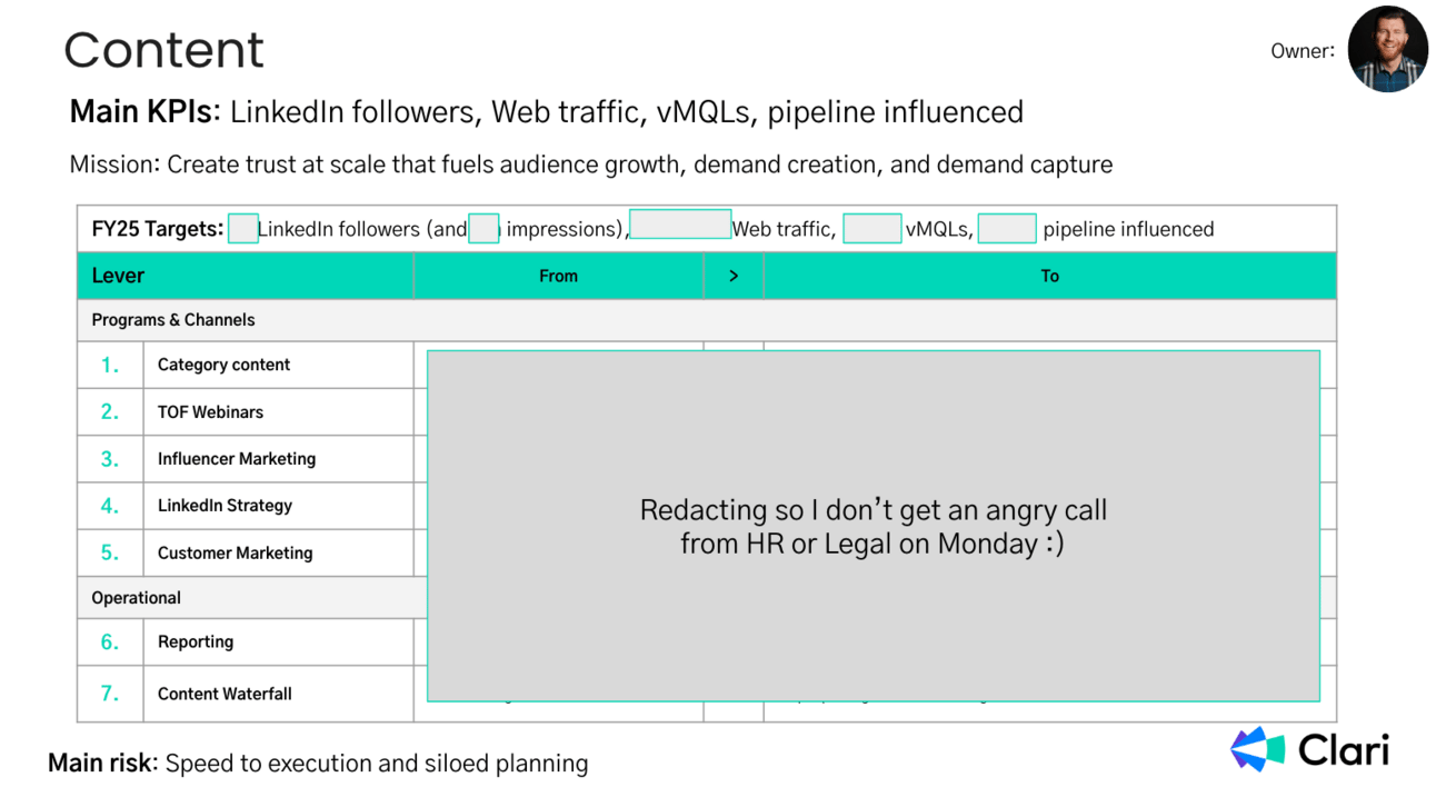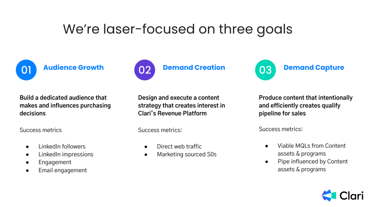 At Clari we have multiple personas who buy and use Clari because we’re a full revenue platform. Reps to execs log in every day, so our content needs to reflect that.