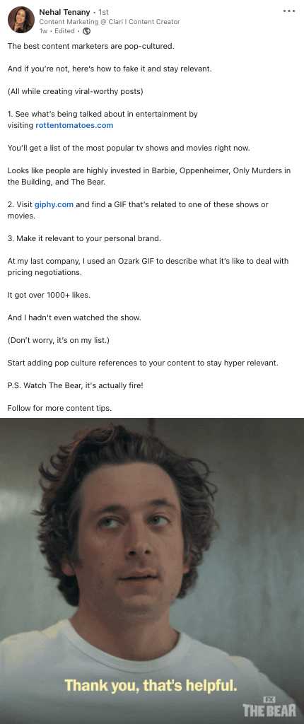 First 😯 because the author, Nehal Tenany, a phenomenal content marketer, popular podcast host, and fast-growing TikTok creator — is beginning to share her expertise on LinkedIn!