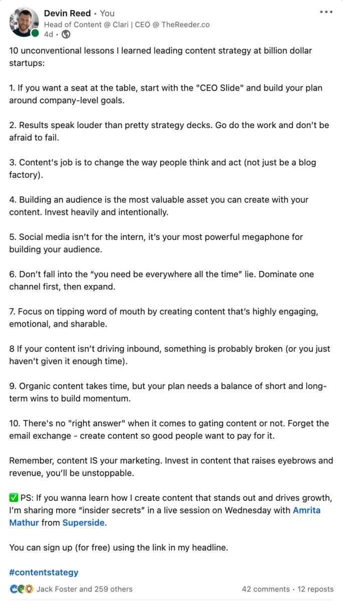 This week I worked on a new hook to package up some of the lessons I’ve learned as a two-time Head of Content at unicorn start ups, which is a pretty niche experience and skillset.